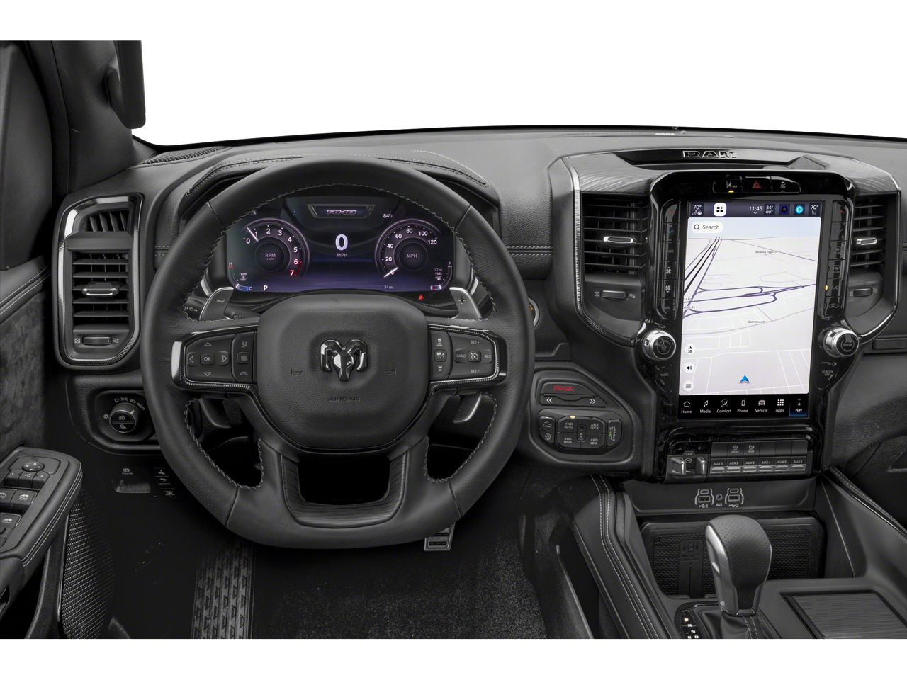 RHO LEVEL 1 EQUIPMENT GROUP Full Length Premium Upgraded Floor Console, Surround View Camera System, Rain Sensitive Windshield Wipers, LED CHMSL Lamp, Power Adjustable Pedals w/Memory, Front Passenger Interactive Display, Traffic Sign Recognition, Hands-Free Active Driving Assist System, Front Passenger Power Seat Back Massage, Head Up Display, Evasive Steer Assist, Heated Second Row Seats, Drowsy Driver Detection, Driver Power Seat Back Massage, Intersection Collision Assist System, Leather/Carbon Flat-Bottom Steering Wheel, Smartphone As A Key Capable, 14.4 Touchscreen Display, Driver/Passenger Wrapped Assist Handles, Dual Wireless Charging Pad, Radio: Uconnect 5 Nav w/14.4 Display, Ventilated Rear Seats, Rear 60/40 Folding Split Recline Seat, 240 Amp Alternator, Ventilated Front, MOPAR PACKAGE Bed Utility Group, MOPAR Spray In Bedliner, MOPAR 4 Adjustable Cargo Tie-Down Hooks, Exterior 115V AC Outlet, MOPAR Deployable Bed Step, MOPAR Rambar, RAM Tool Bag, MOPAR Cable Kit, MOPAR Off-Road Style Running Boards, MOPAR Bed-Mounted Tire Carrier, Wheels: 18 x 9 Bead-Lock Aluminum, Blue Tow Hooks, MOPAR Lockable Console Storage, MOPAR 25 Hood Graphics, MOPAR 25 Side Graphics, Multi-Function Accessory Rail, MOPAR 25 Serialized Console Plaque, MOPAR 25 Tailgate Graphic, TRANSMISSION: 8-SPEED AUTOMATIC (8HP75) (STD), ENGINE: 3.0L I6 HURRICANE HO TWIN TURBO ESS (STD). Ram RHO with Diamond Black Crystal Pearlcoat exterior and Black interior features a Straight 6 Cylinder Engine.