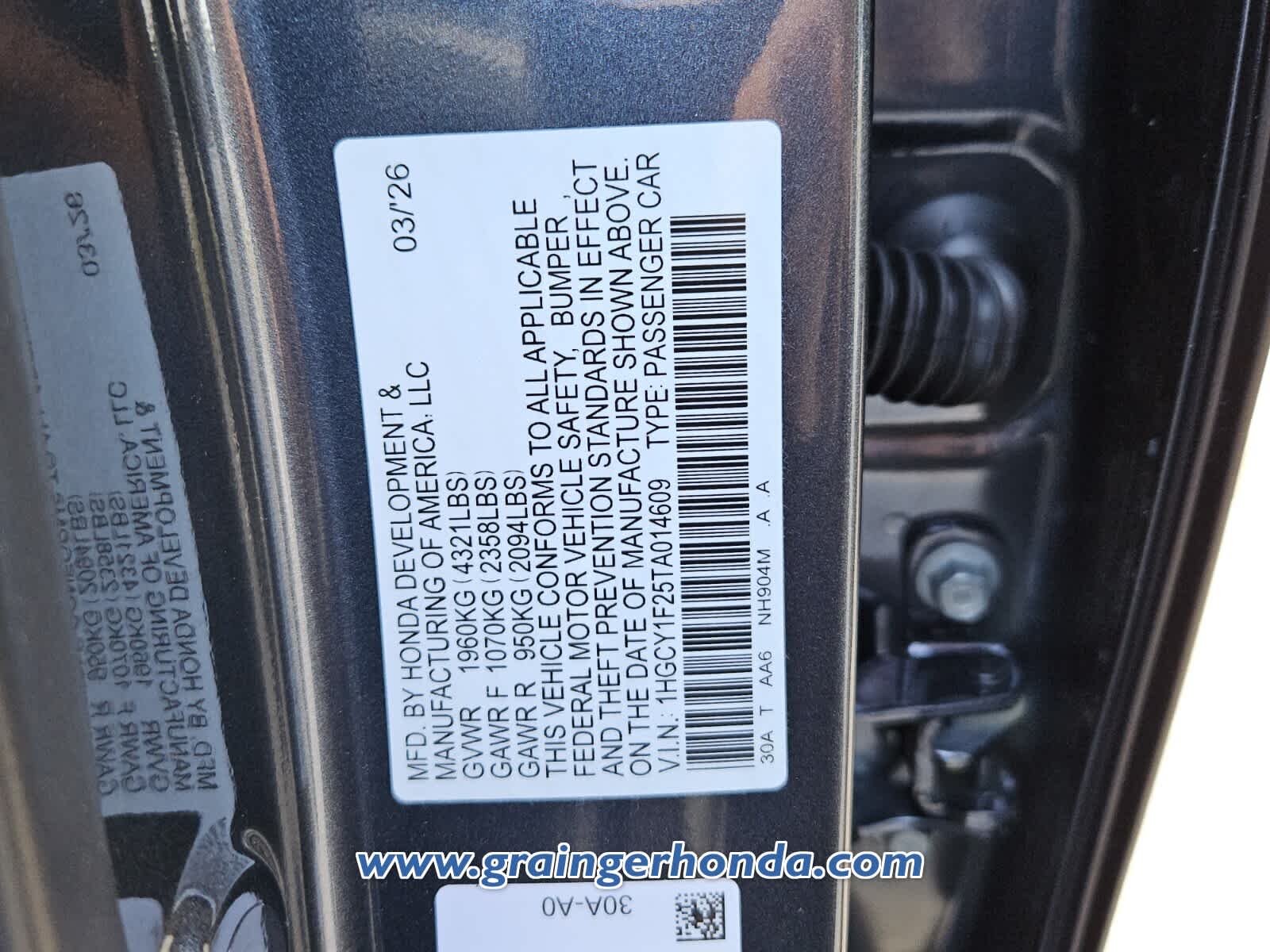 VIN 1HGCY1F25TA014609