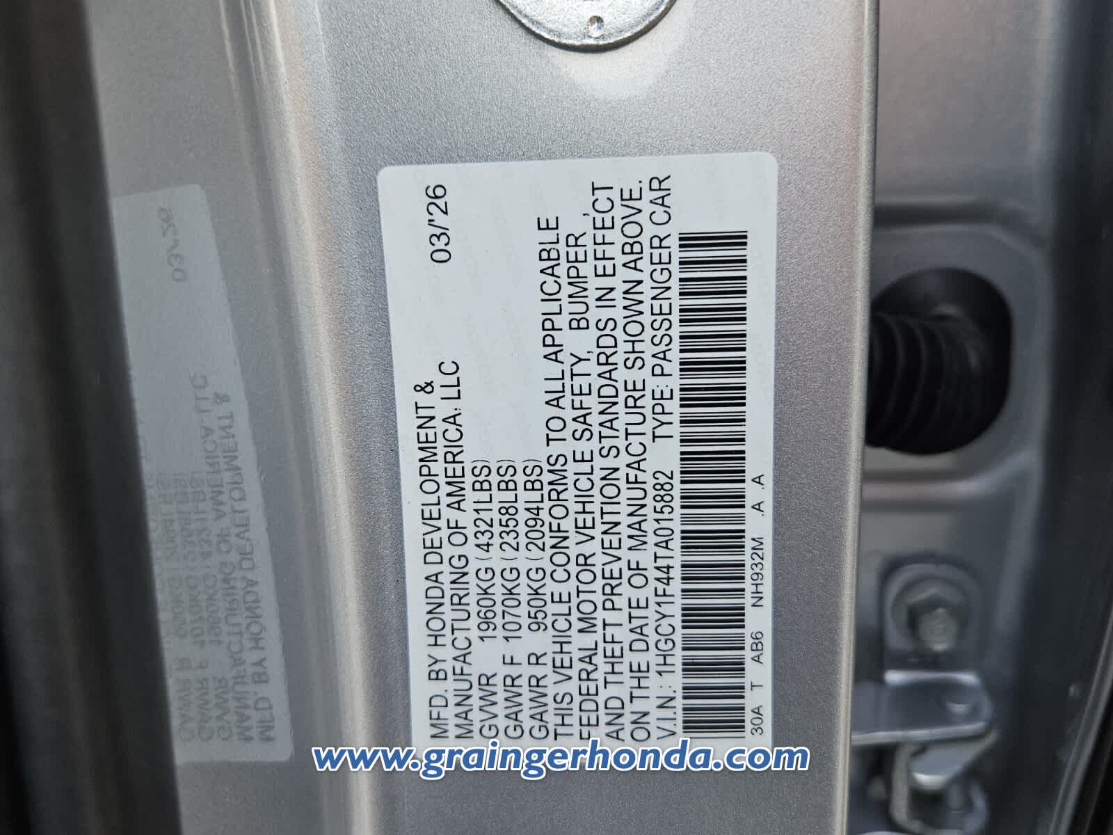 VIN 1HGCY1F44TA015882